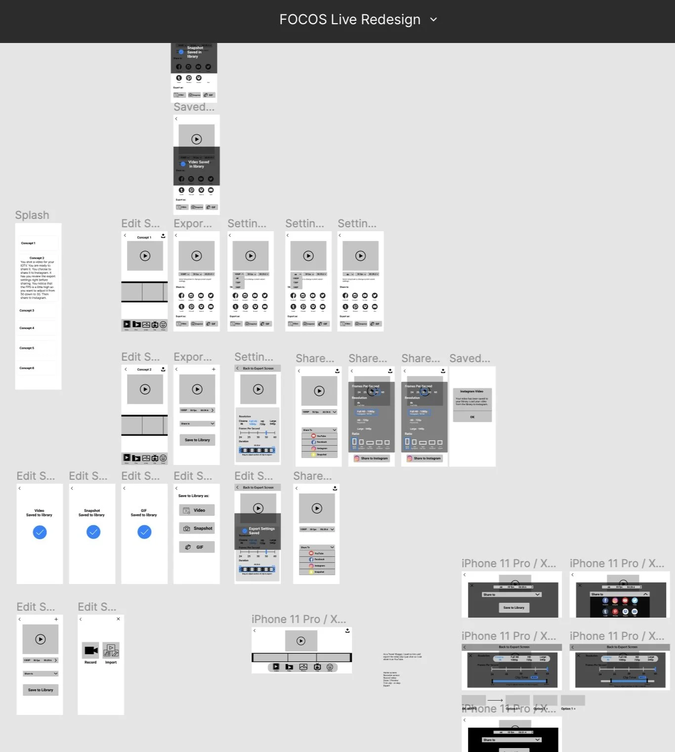 I created User flows that display the complete path a user takes while using the FOCOS Live application. I lay out the user’s movement through the app, mapping out each and every step the user takes. Starting from opening the video editing app to the final interaction.
