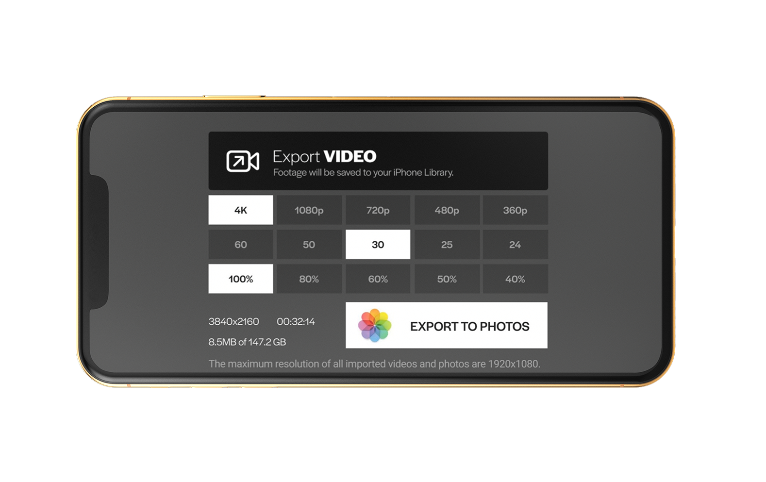 Since users mainly shoot and export, we wanted to make the export flow as clear and user-friendly as possible. We accomplished this by making a grid that was easily accessible for changing settings to the desired resolution, FPS, and quality.