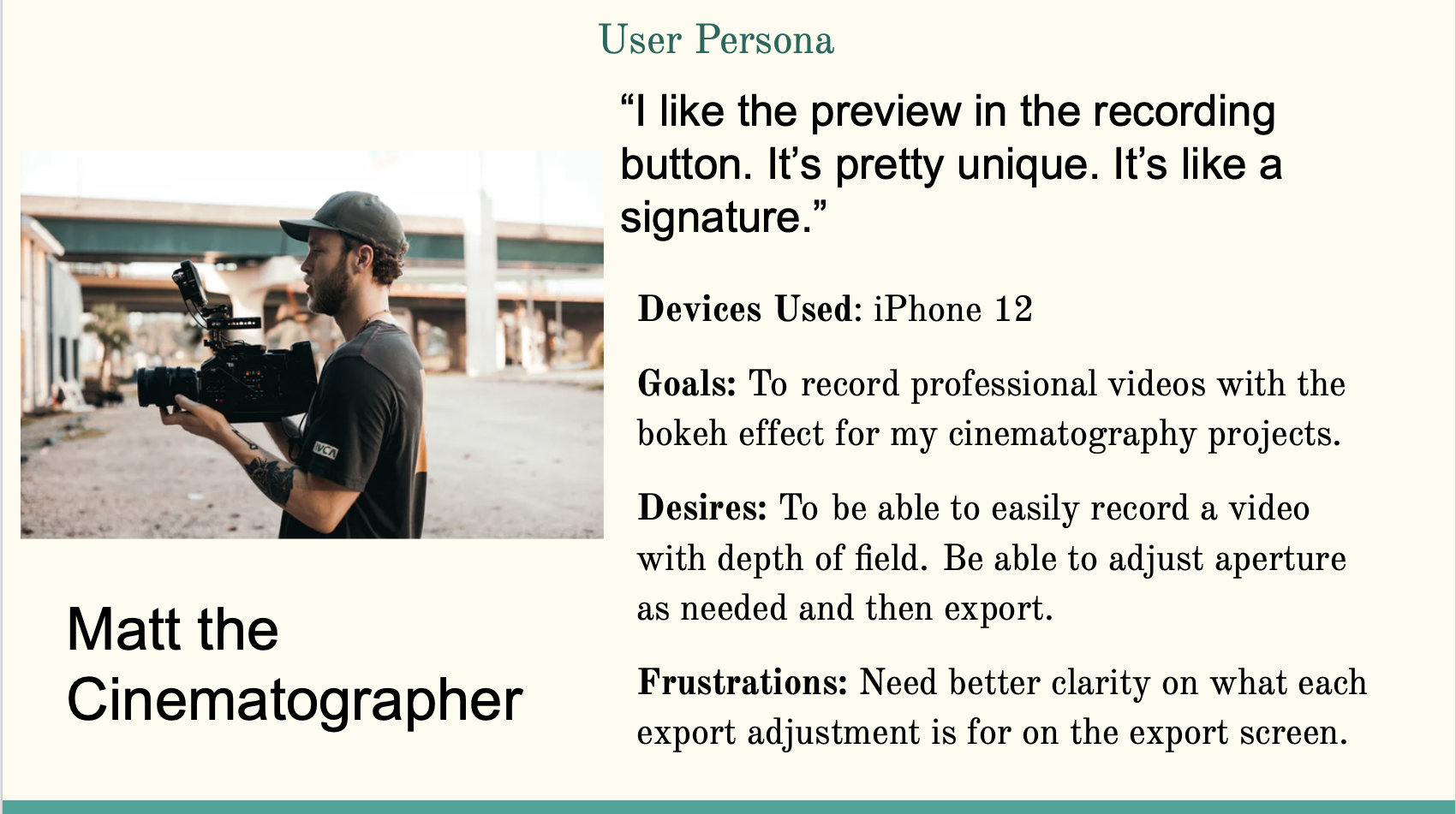 I created personas based off the power user’s goals, desires, and frustrations with the current FOCOS Live video and editing application.