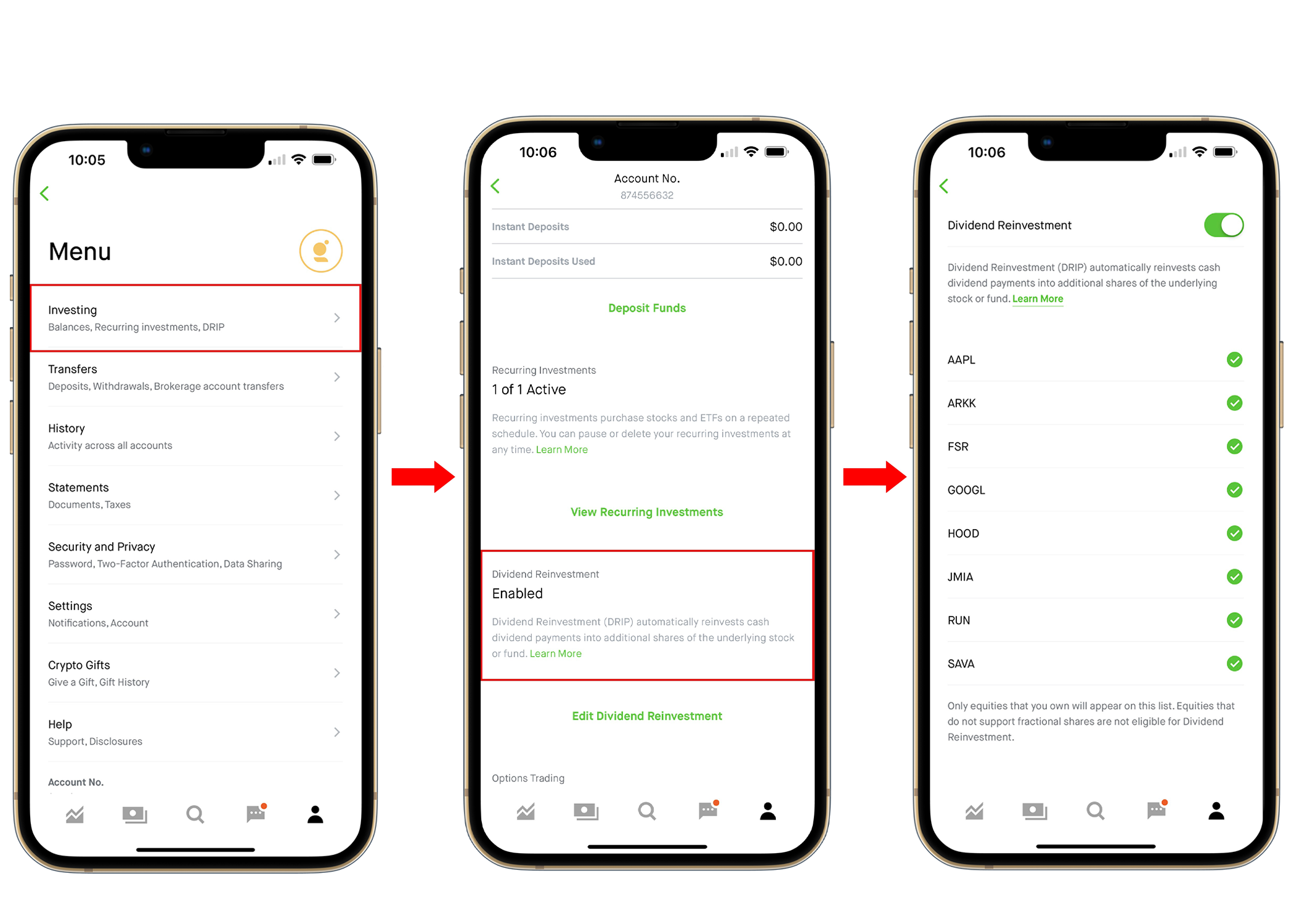 However, when I interviewed users, none of them knew about DRIP or what it was. The only way to access if go to Menu and then scroll down on the investing screen. Which makes it buried and not easy to find.
